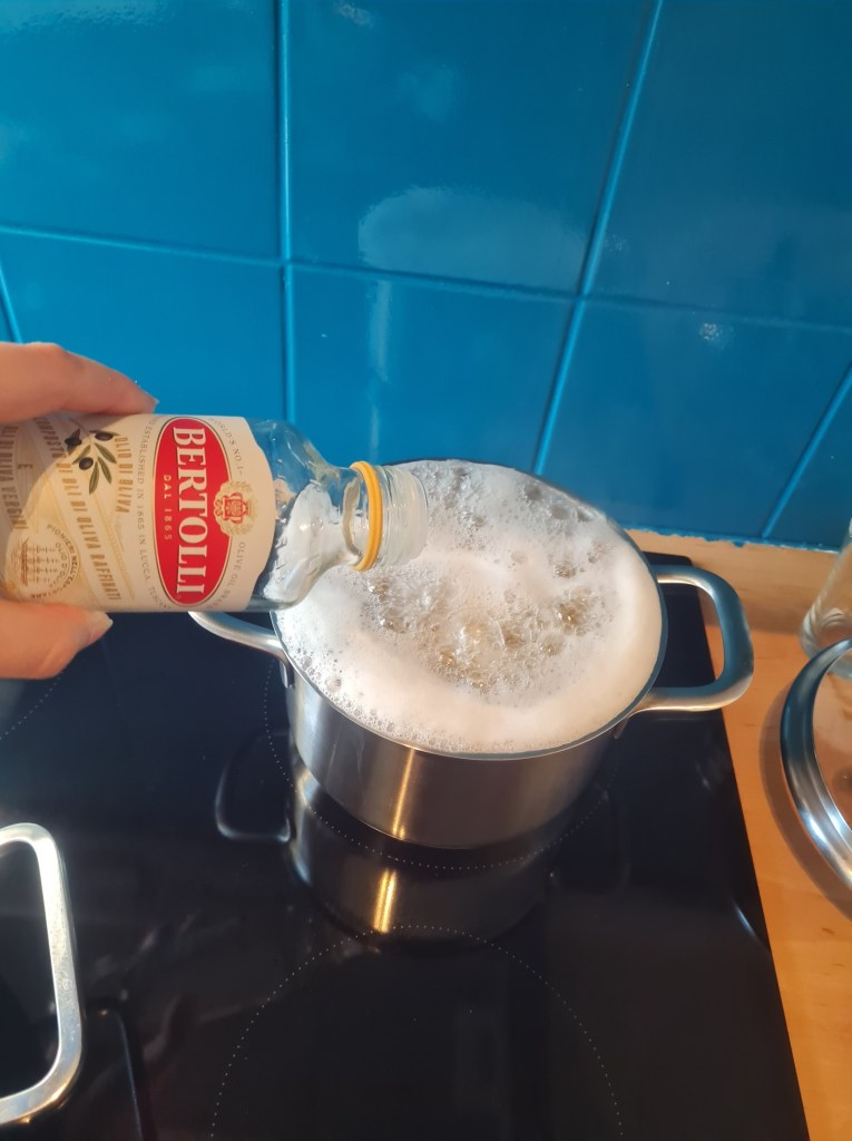 Zet een grote pan met water op het vuur. Als het water kookt, voeg je de gehele zak pasta toe. Zet het vuur ietsje lager, zodat het niet gaat overkoken. Doe een klein beetje olijfolie in de pan met pasta, dit voorkomt dat de pasta aan elkaar gaat plakken. Kijk op het pak voor de kooktijd van de pasta.