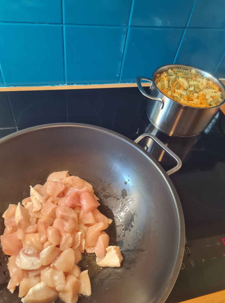 Snijd de kipfilet in blokjes. Doe wat olijfolie in een grote, vuurbestendige (wok) pan en bak de kip op middelhoog vuur. Voeg een beetje zout en peper toe naar smaak.