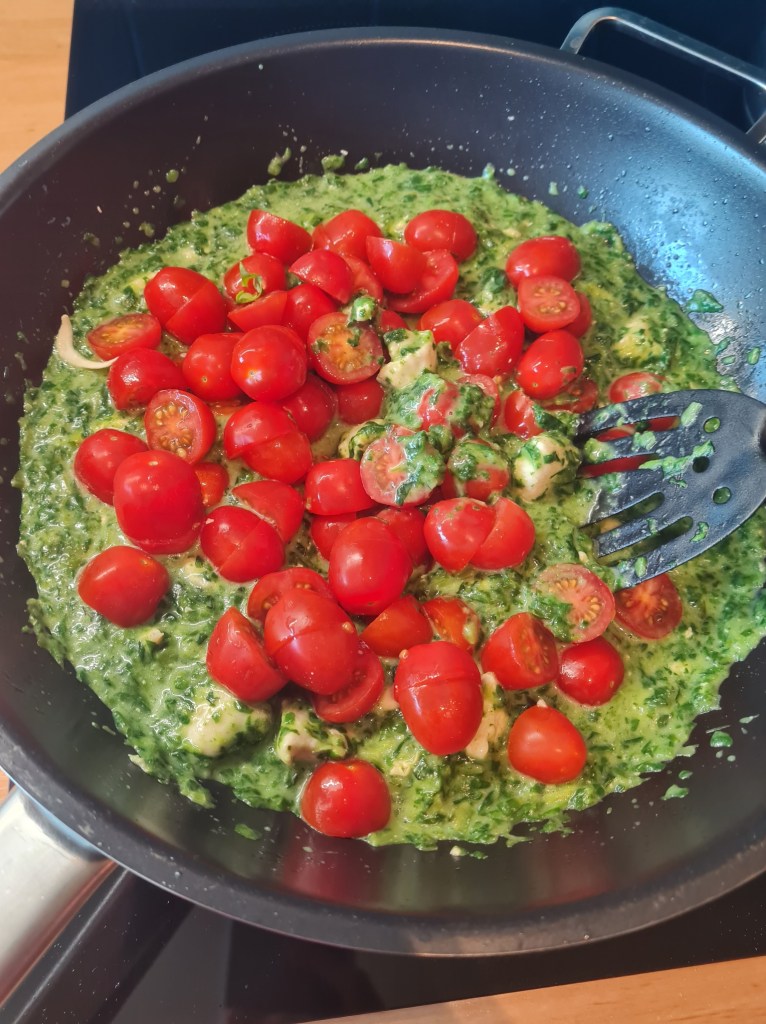 Als de kip bijna gaar is, voeg je de spinazie á la crème met Boursin toe. Roer dit goed door elkaar, totdat de spinazie smeuïg is.