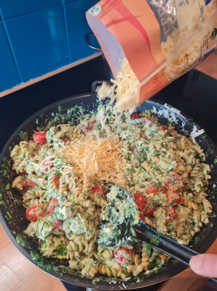 Strooi de helft van het zakje geraspte kaas in de pan. Roer dit goed door het mengsel heen. Door de warmte gaat de geraspte kaas smelten. Hhmm!