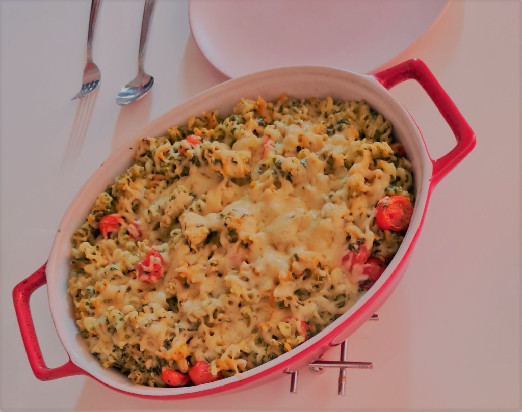 Als ‘finishing touch’ strooi je de andere helft van de geraspte kaas over het mengsel en zet je de pan in de oven voor ongeveer 10 minuten. De pasta is klaar als de kaas bovenop goudbruin is.